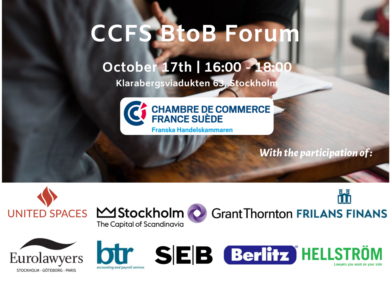 Un événement inédit vous est proposé par la Chambre de Commerce France Suède le jeudi 17 Octobre. Venez participer au premier CCFS BtoB Forum de Stockholm !
