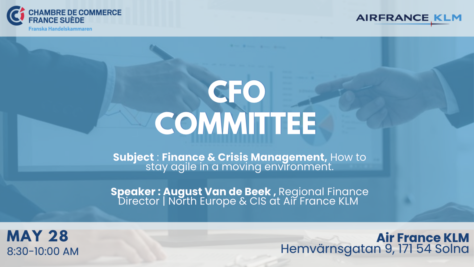 We are pleased to invite you to our next CFO Committee on Wednesday, May 28th from 8:30 to 10:00 at the Air France / KLM offices in Stockholm, over breakfast.
