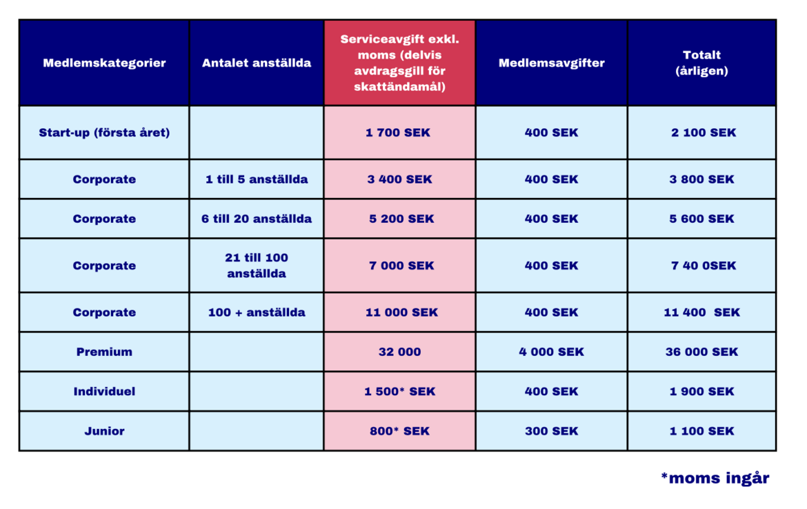 OBS: Större delen av medlemsavgiften (serviceavgiften) är skatteavdragsgill för företag som beskattas i Sverige.